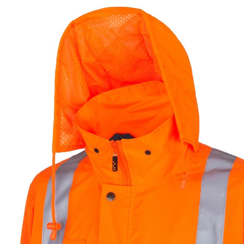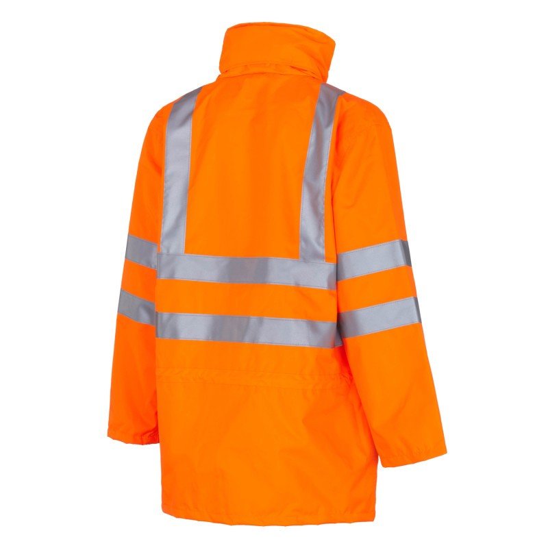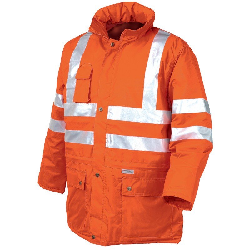 Giacca alta visibilità imbottita con interno fisso. Cappuccio a scomparsa, chiusura con cerniera ricoperta da patta e bottoni a pressione, due tasche esterne scaldamano tipo tridimensionale doppio uso (di cui una con porta badge), taschino portacellulare, coulisse in vita, bande retroriflet enti 3M Scotchlite®. Polsini interni in maglia. Cuciture termosaldate. Composizione: 300D poliestere oxford spalmato PU impermeabile e traspirante con trattamento TEFLON, con fodera e imbottitura in poliestere. Taglie: S-M-L-XL-XXL Colore: arancio fluo.