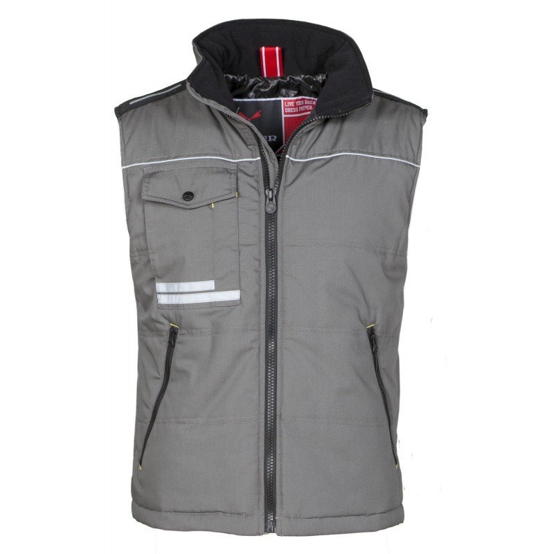 Gilet trapuntato con una ampia tasca la petto porta smart-phone con porta penne e bande riflettenti; anello porta badge, due ampie tasche con zip sul davanti e una tasca interna. 80% Poliestere, 20% cotone 170 gr/mq Taglie disponibili dalla S alla 5XL nei colori blu o grigio.
