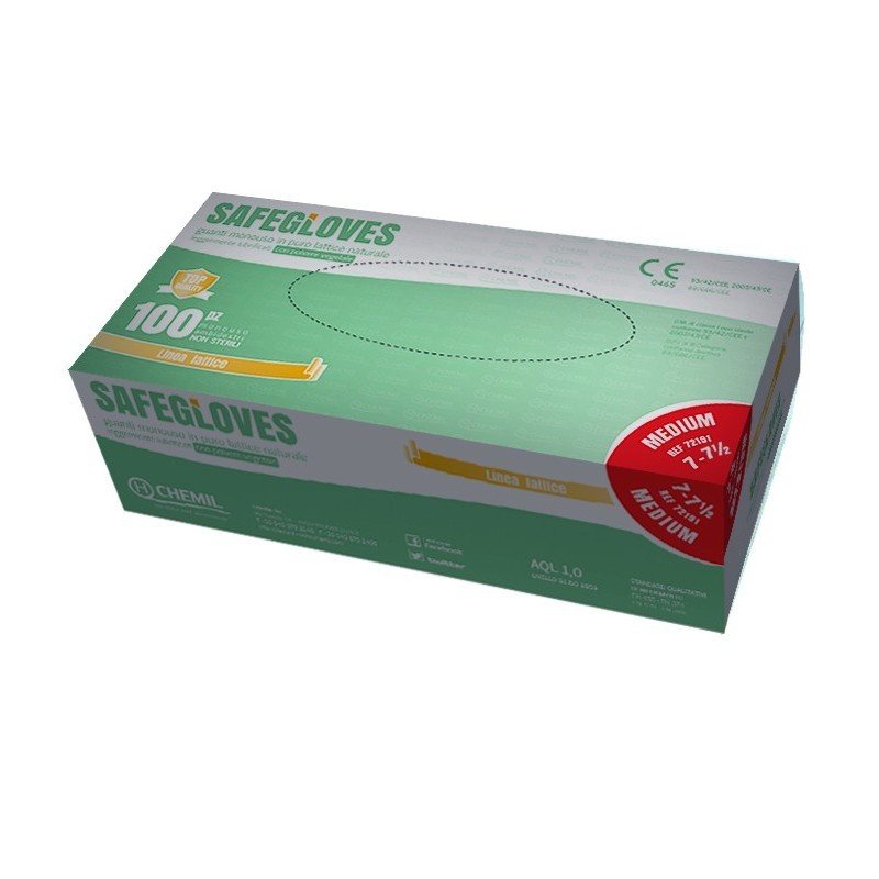 Guanti in lattice monouso confezione da 100 pz. Prepolverati, ambidestri, leggermente lubrificati con polvere vegetale conforme USP, AQL 1,0. Dispositivo Medico di classe I non sterile Dispositivo di Protezione Individuale di III categoria. Taglie disponibili dalla S alla XL.