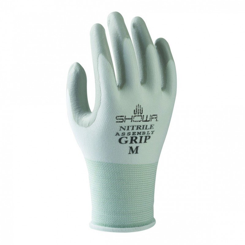 Guanto Showa 370 rivestimento del palmo in nitrile su fodera in nylon bianco. Maglia in nylon senza cuciture, il design ergonomico riproduce la curvatura naturale della mano. Applicato in vari settori come agricoltura, orticoltura ed edilizia.