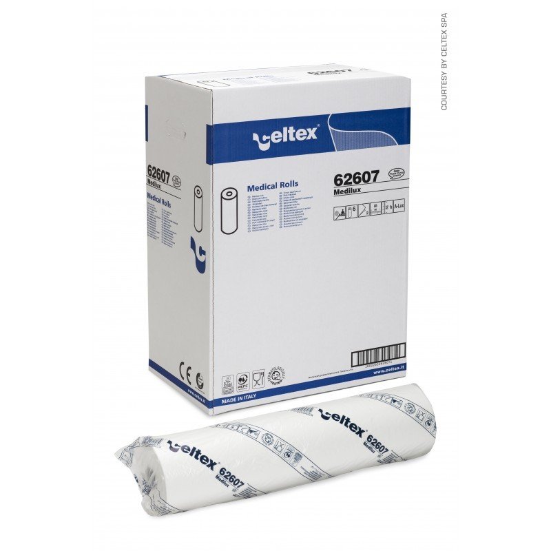 Lenzuolino medico Medilux. 100% pura cellulosa, 2 veli, h. rotolo 60 cm, lunghezza 80 mt. Scatole da 6 rotoli.